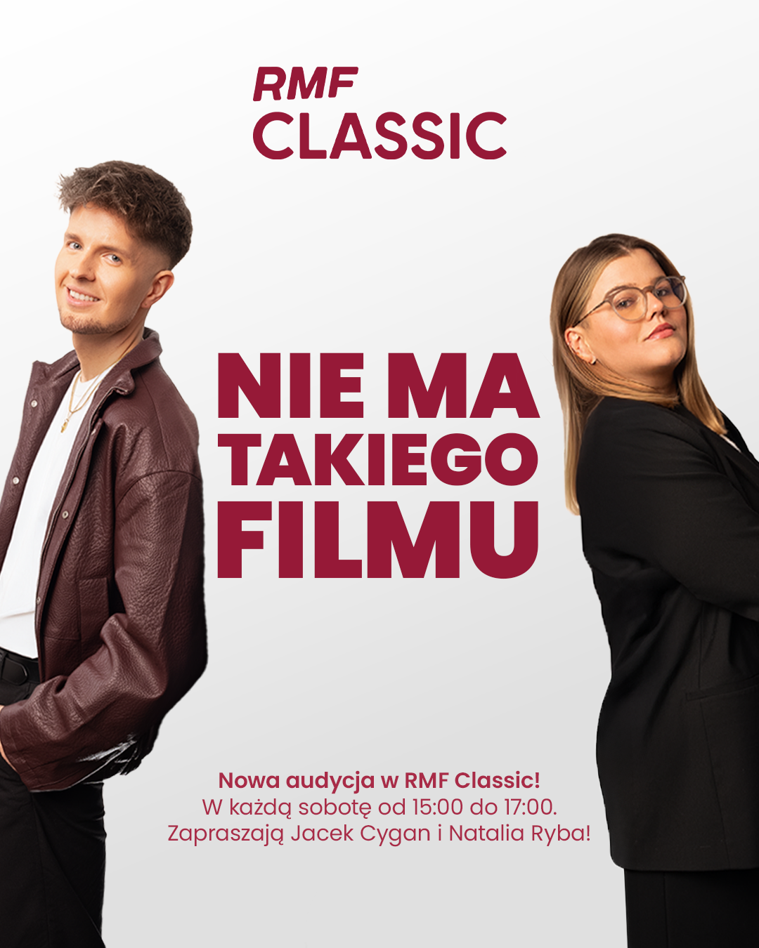 Już od 10 stycznia w każdą sobotę w RMF Classic, w godzinach 15:00–17:00, będzie można posłuchać nowej audycji „Nie ma takiego filmu”. Natalia Ryba i Jacek Cygan będą łączyć filmoznawczą wrażliwość z aktualną branżową perspektywą, by rozmawiać o filmach z pasją i entuzjazmem.