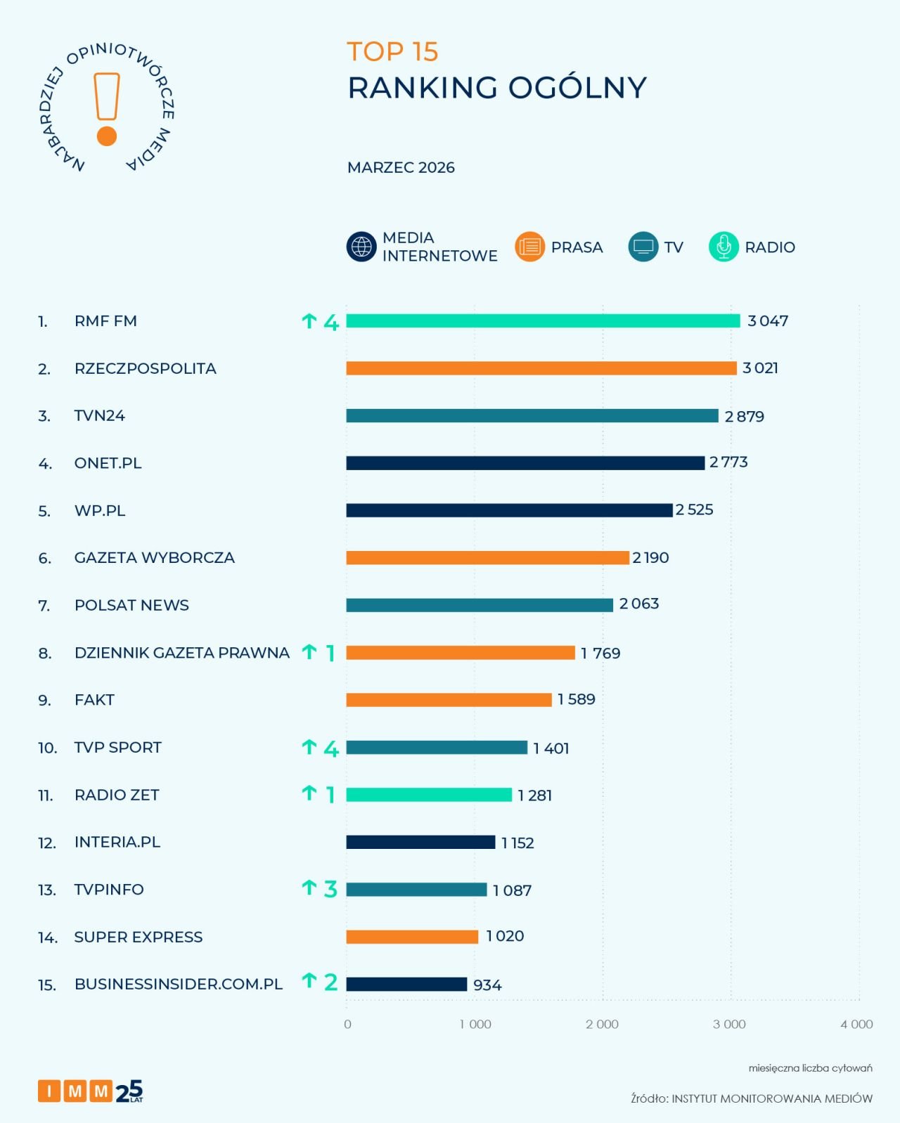RMF FM znalazło się na pierwszym miejscu marcowego rankingu „Najbardziej opiniotwórczych mediów w Polsce”, przygotowanego przez Instytut Monitorowania Mediów. Stacja odnotowała 3047 cytowań, wyprzedzając tym samym m.in. „Rzeczpospolitą”, TVN24 czy Onet.pl.